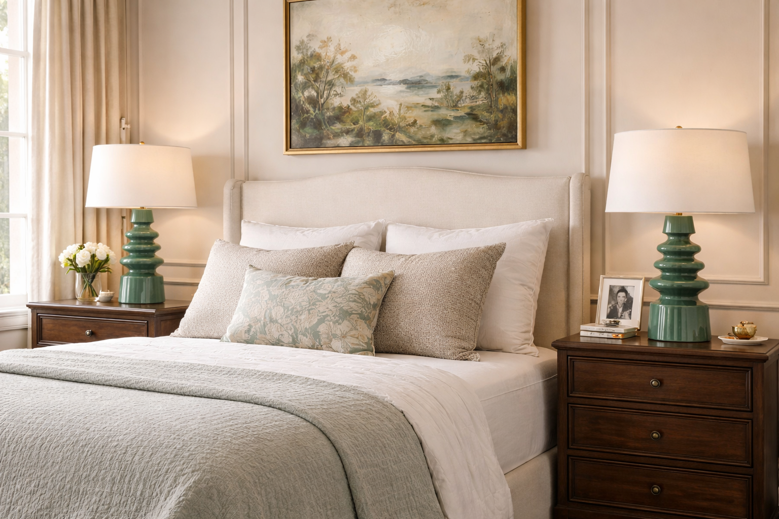 • COMING SOON. Sculptural ceramic table lamp by Julie Neill for Visual Comfort with linen shade and gold accents. A refined statement lamp for living rooms, bedrooms, and elegant interiors. Available in green, blue or white.