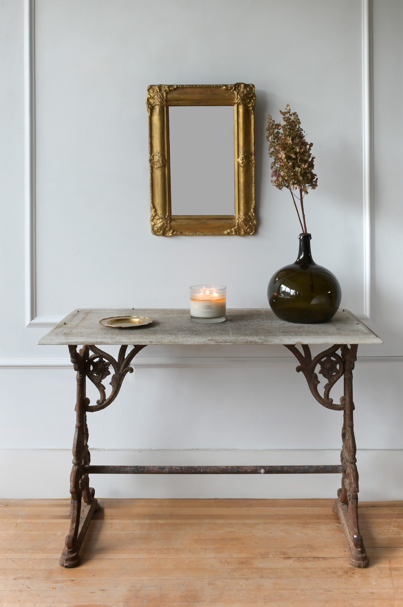 An exquisite 19th-century English garden table, this piece pairs a richly veined marble top with stunning, detailed cast iron legs. Elegant yet versatile, it adds timeless charm to both indoor and outdoor spaces.
