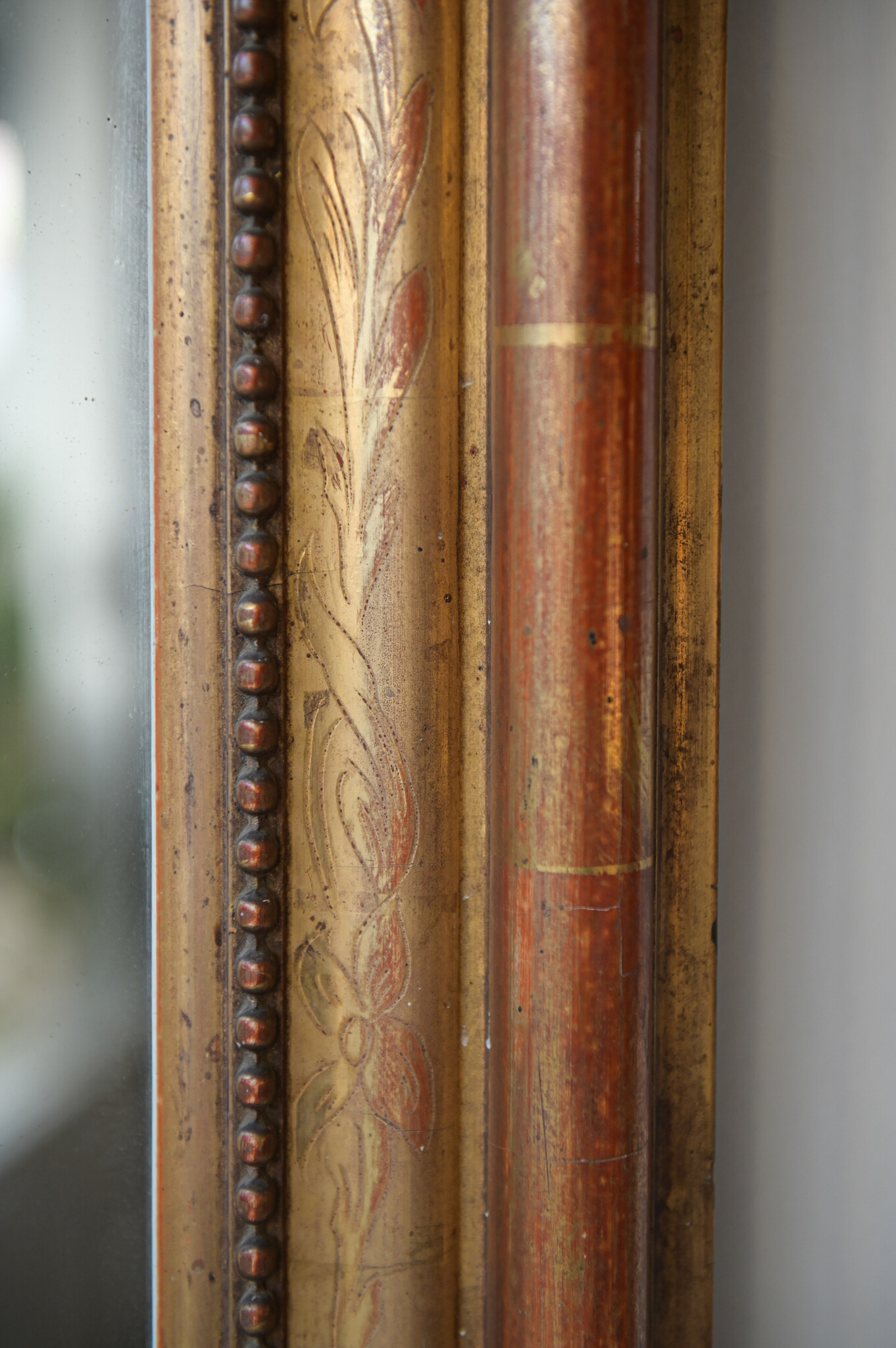 A rare antique tall narrow mirror, or a "miroir d’entre deux", which is a narrow mirror intended to go between windows or doors. Beautiful gilt wood frame with original mercury glass mirror. Circa 1800, from France.