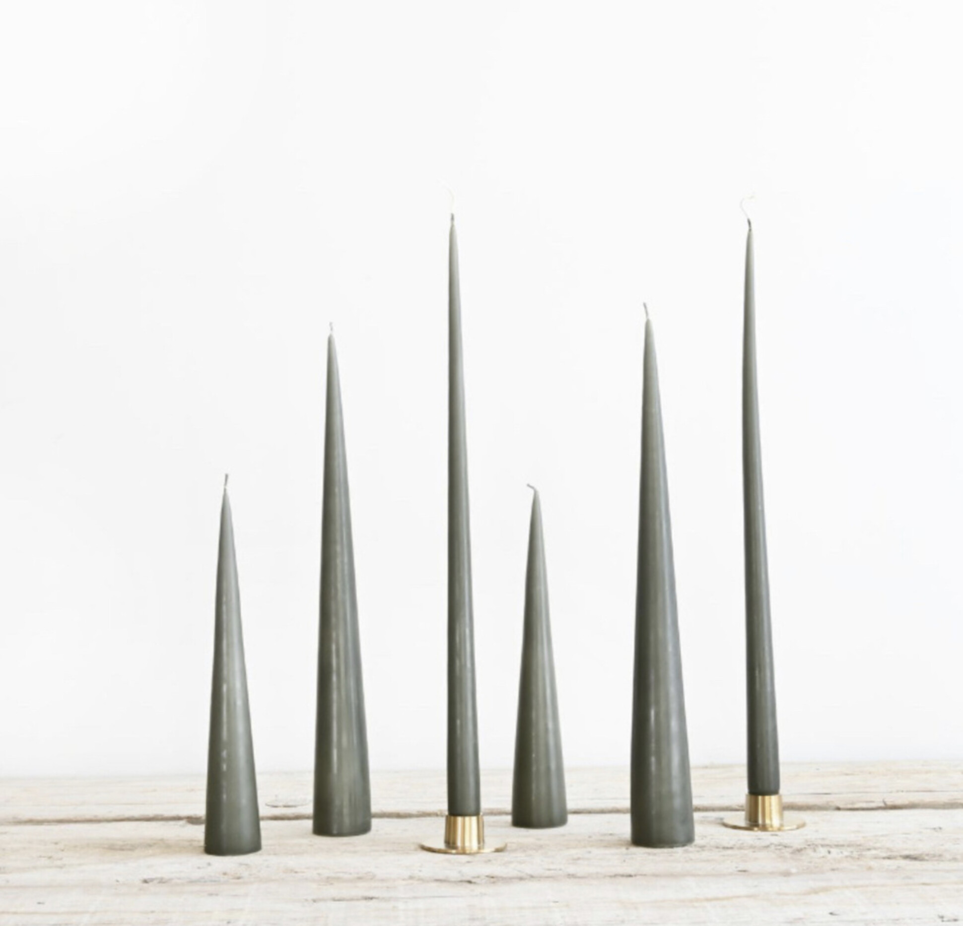 Pick No. 7 Elegant slender tapered candle. Unique fine, pointed top. Made in Denmark by Ester & Erik, these candles are the perfect dinner candle in gorgeous muted mix-and-match colours. Unscented. Matte finish. Price is for a same-colour pair. Candles $22, brass candle holders $68. Both sold as a set of two.