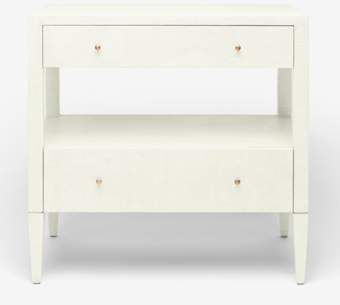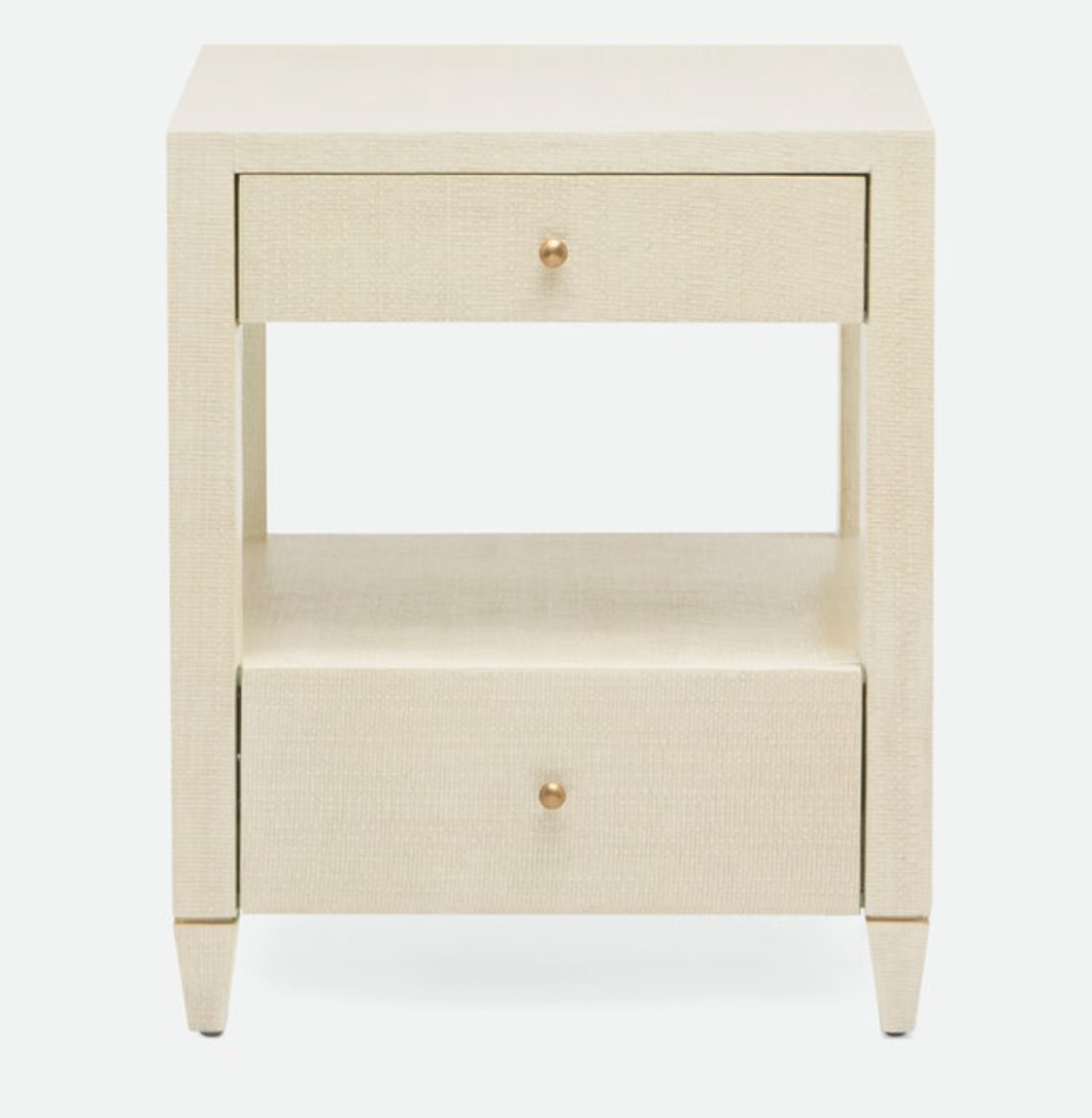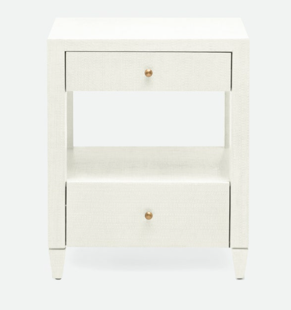 A raffia-like resin finish gives this bedside table a touch of glamour.