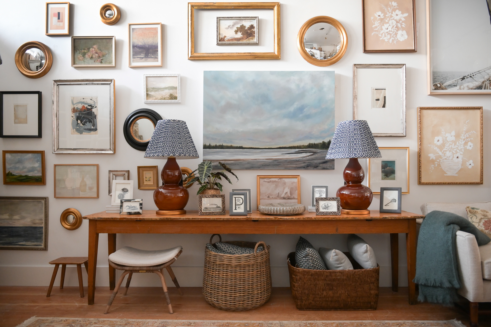 This small convex mirror features a beautifully water-gilded wood frame and classic round silhouette. Imported from France, it adds timeless European charm and reflective depth to gallery walls, shelves, and interiors. Available in Vancouver.