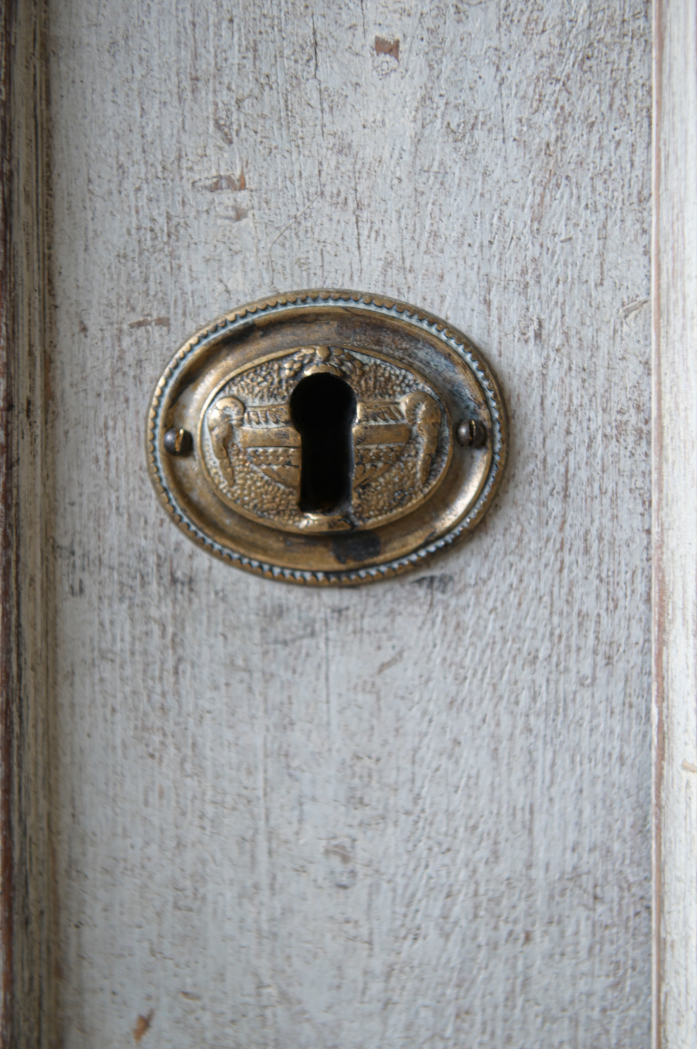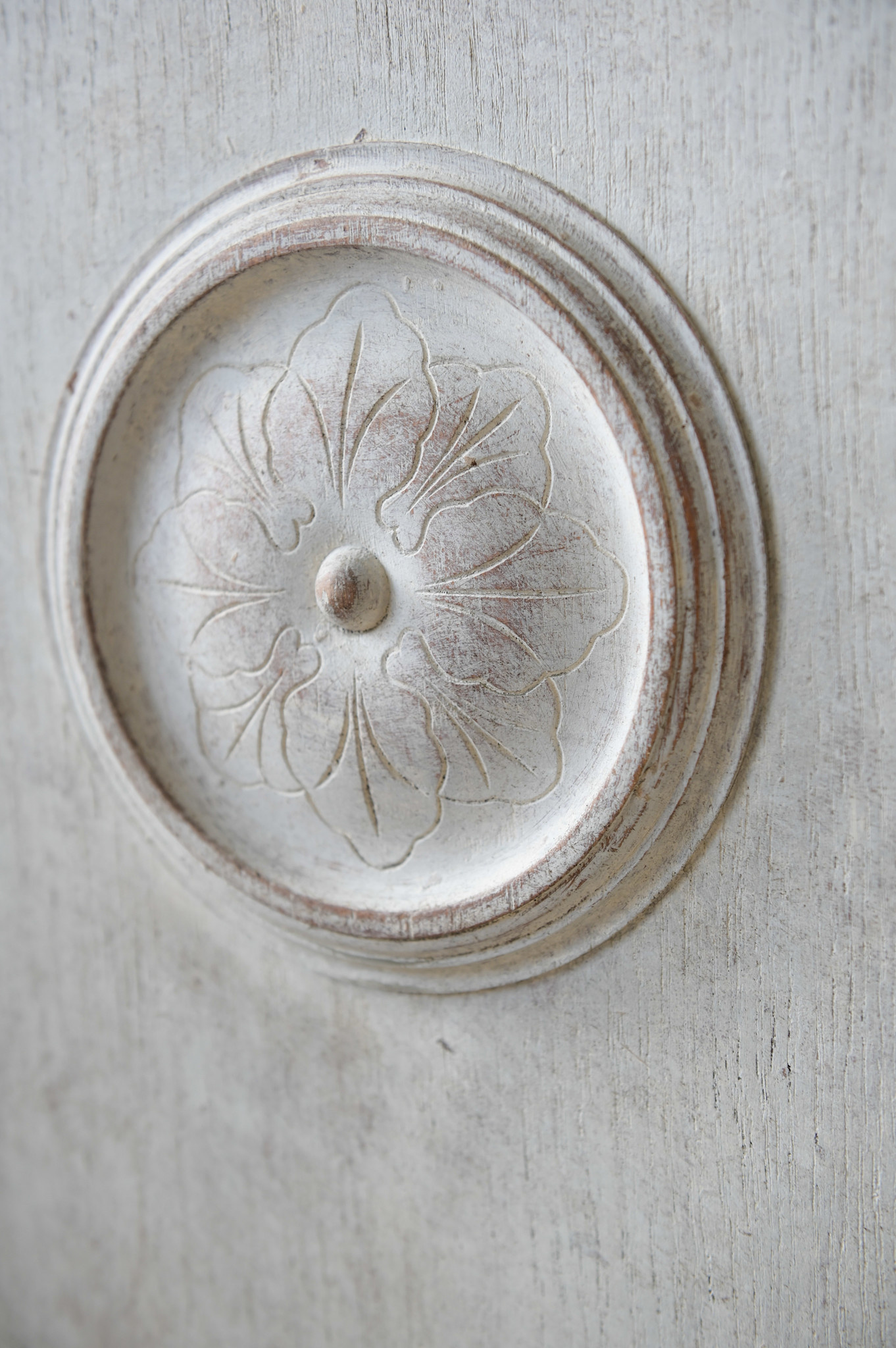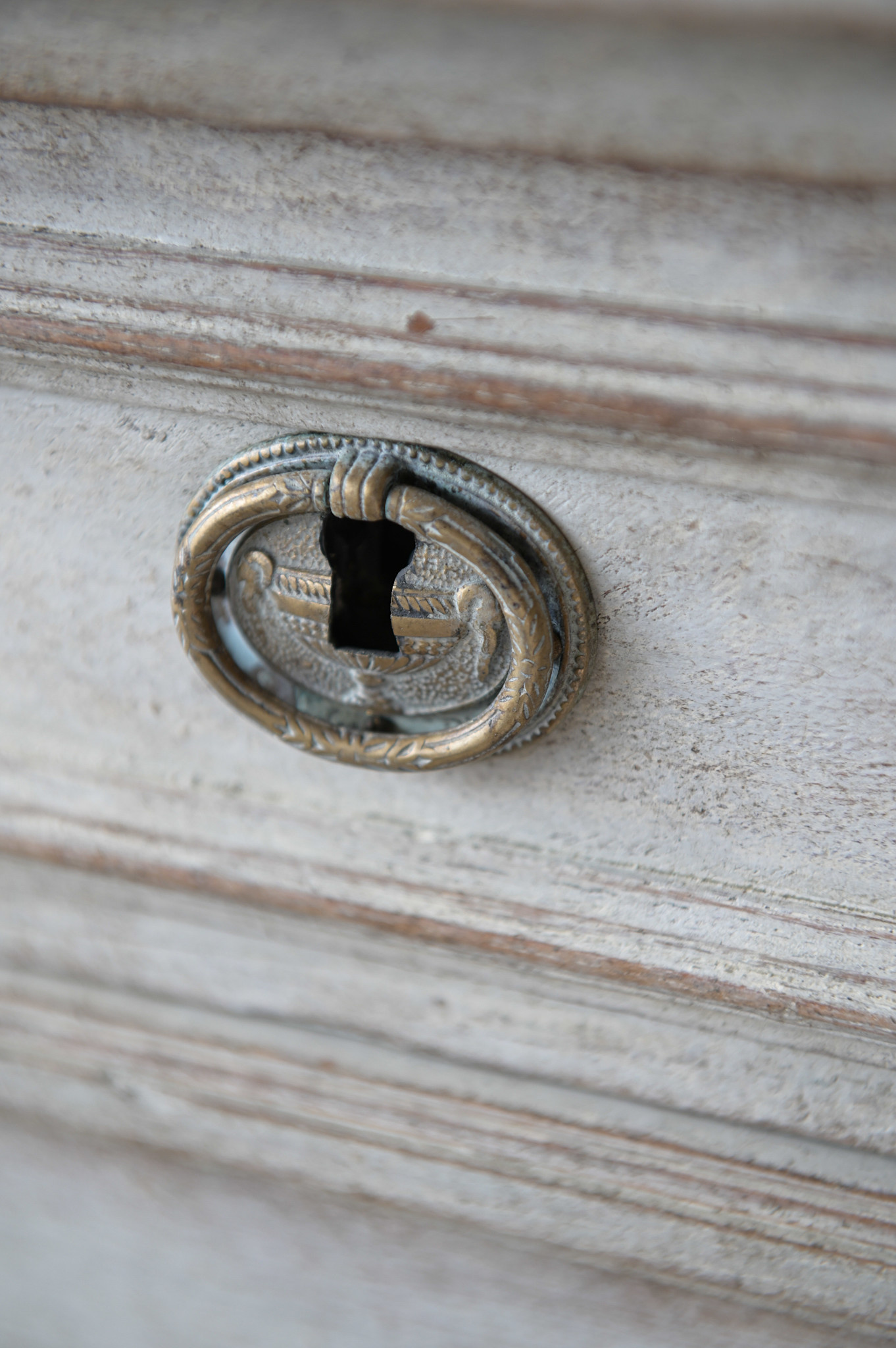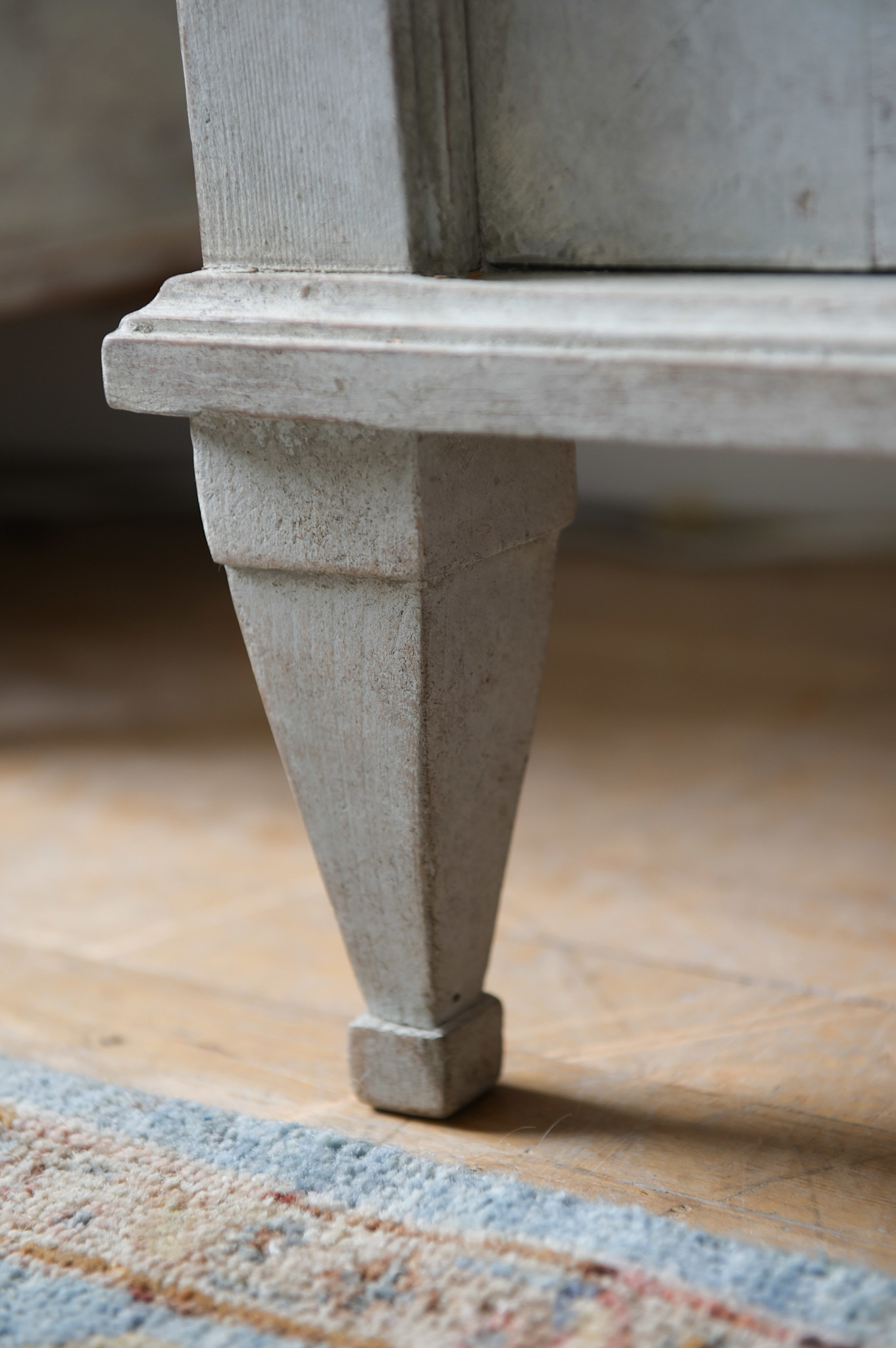 • Gustavian sideboard in a soft grey with subtle blue undertones. Swedish, circa 1890–1910. Featuring two drawers and double doors with original locks, decorative detailing, and tapered legs. Oak and pine. 41” H x 48.2” W x 20.1” D.