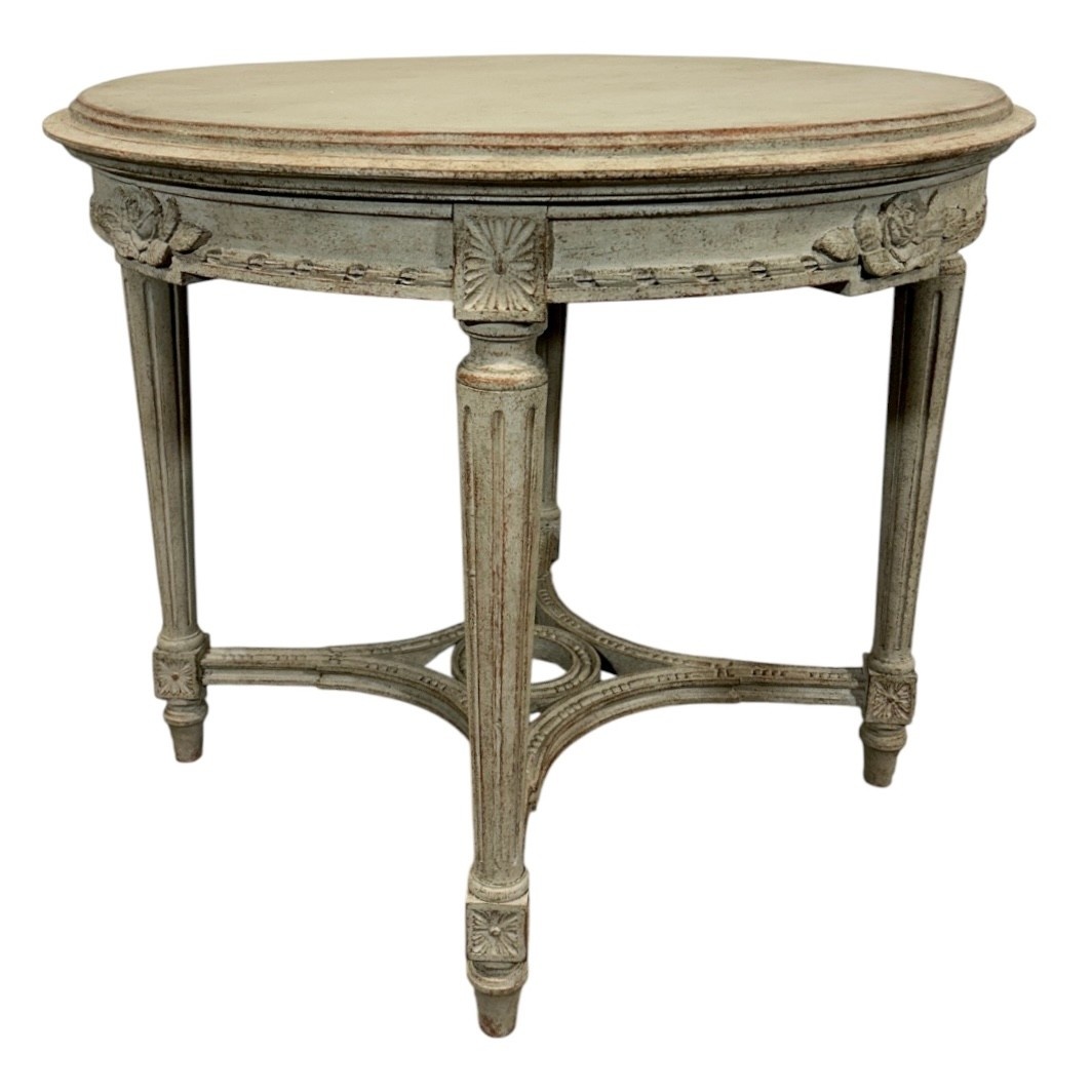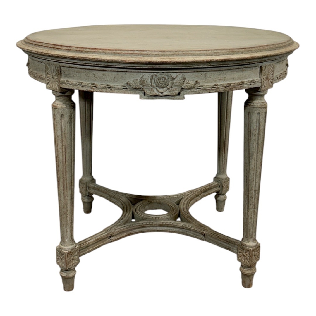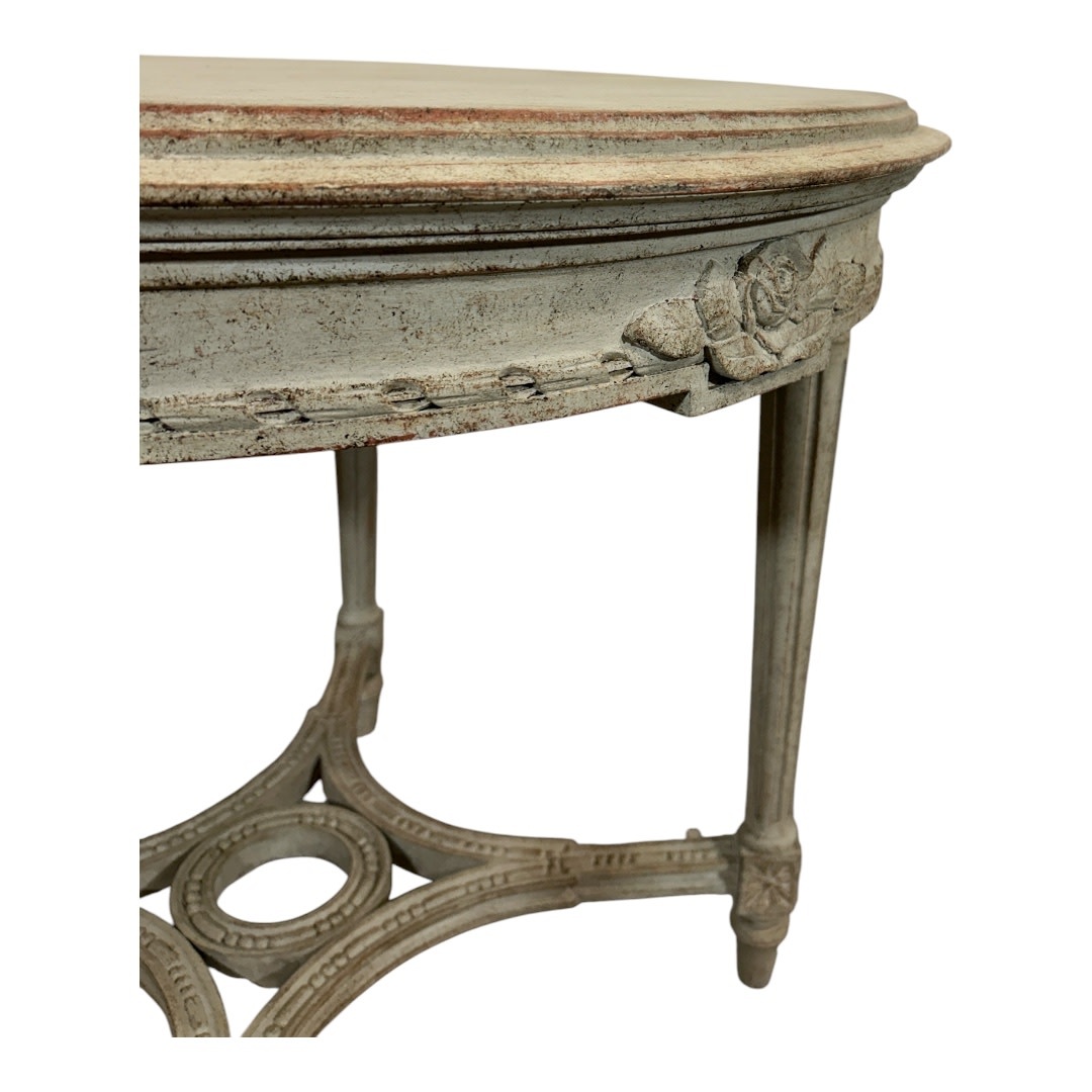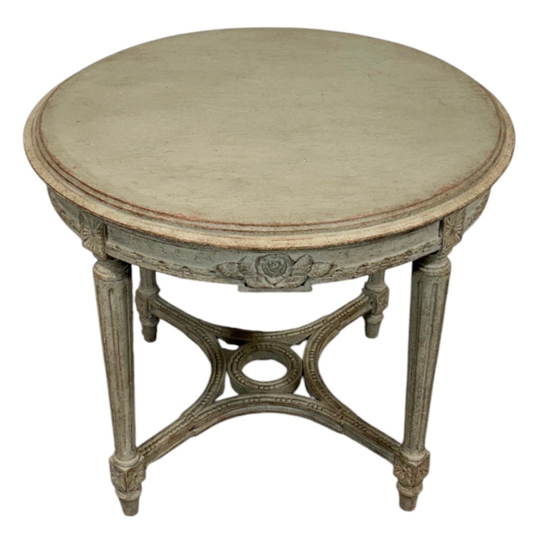 A set of 4 Gustavian style chairs made of beech wood. The backrests of the chairs and the edge of the seat have rich decorations referring to the Gustavian style. The legs have a round shape and are richly decorated. Chairs need new upholstery.