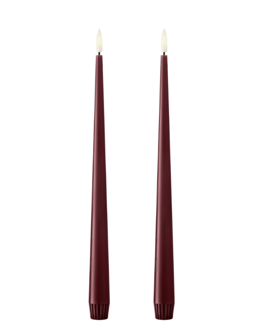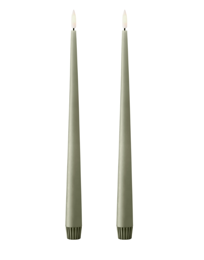 Elegant slender tapered candle. Unique fine, pointed top. Made in Denmark by Ester & Erik, these candles are the perfect dinner candle in gorgeous muted mix-and-match colours. Unscented. Matte finish. Price is for a same-colour pair. 17″ tall (43 cm).