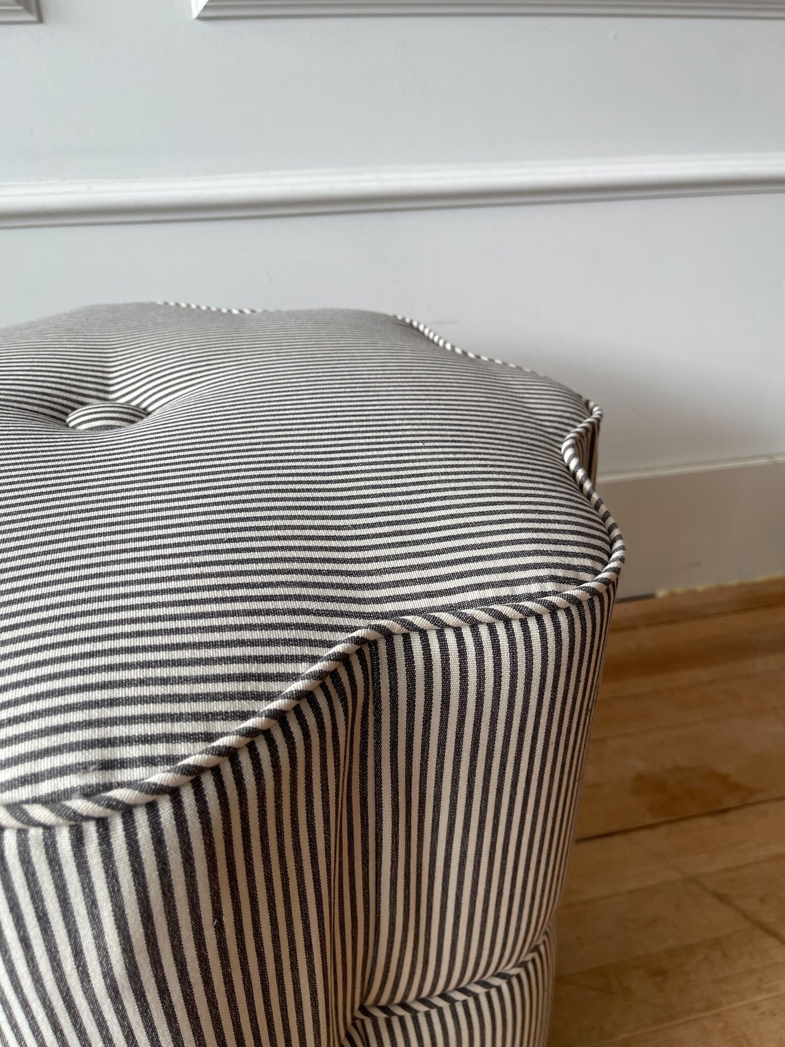 Elevate your space with the Melanie round tufted ottoman by Gild & Co. Seen here in luxurious Sanderson woven small-scale pattern, it features solid wood construction. Designed and built locally, each ottoman is made to order in your choice of fabric.