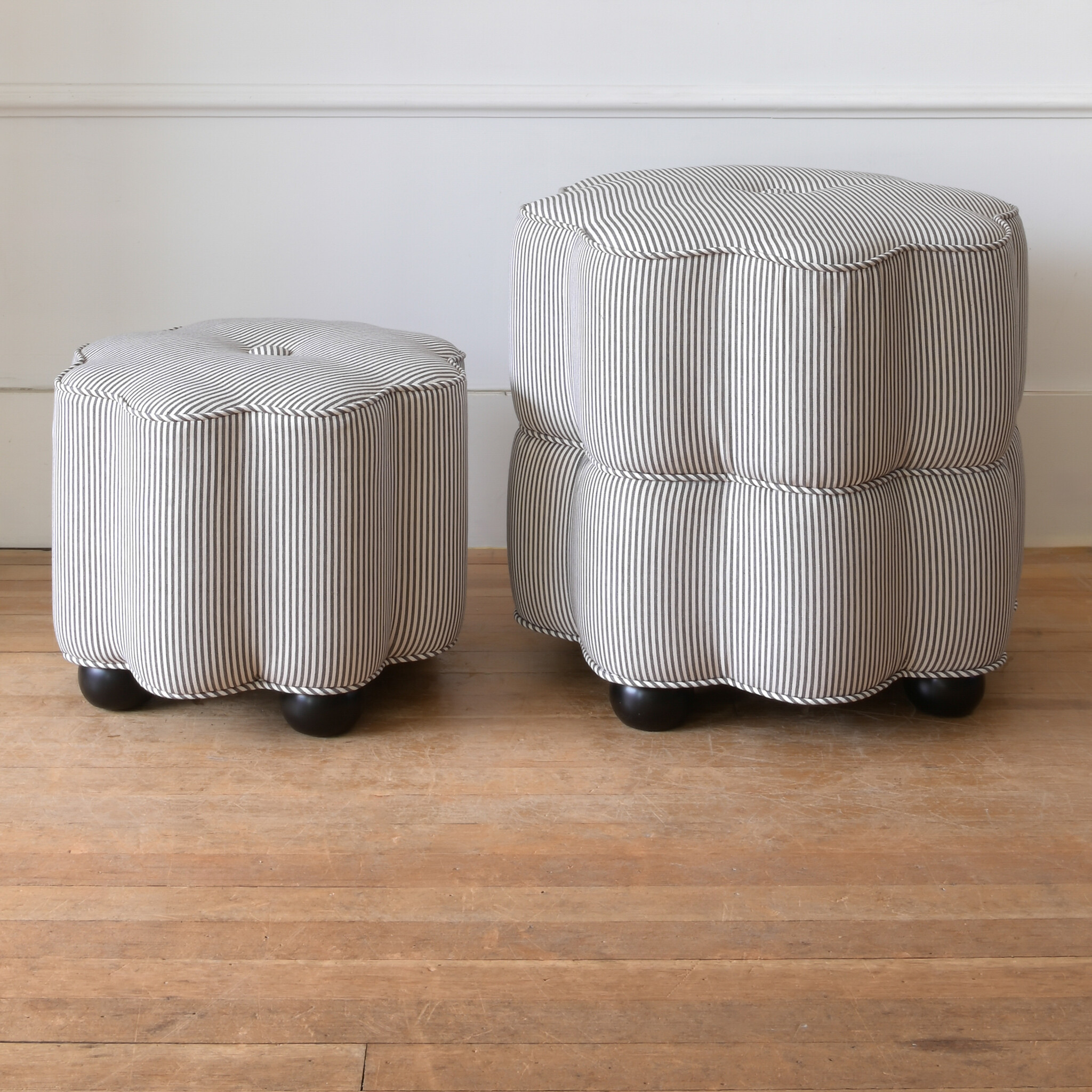 Shop the Ella Stool by Gild & Co. in Oswin charcoal stripe fabric. A handcrafted, Canadian-made upholstered stool with a sculptural floral shape and timeless design.