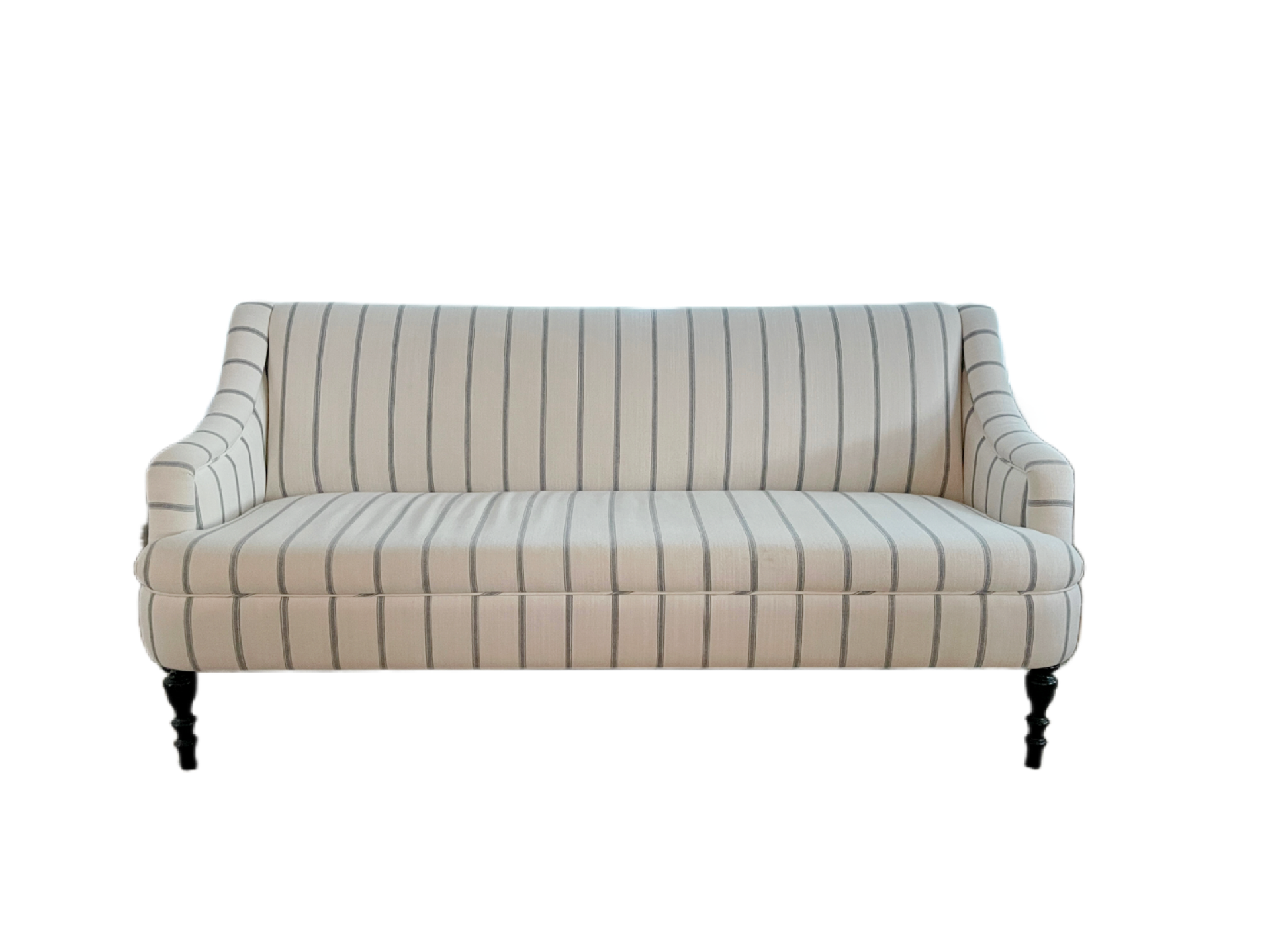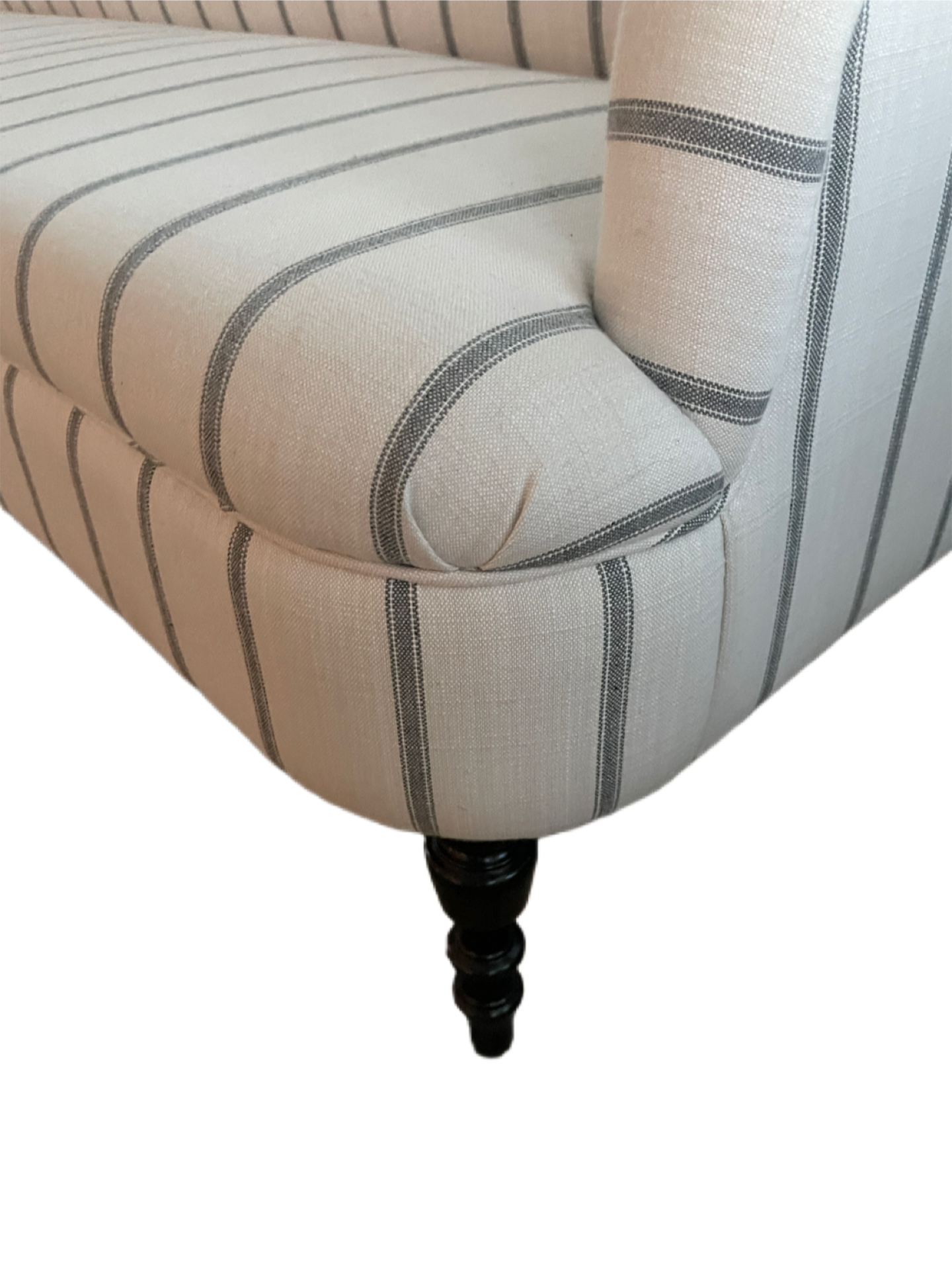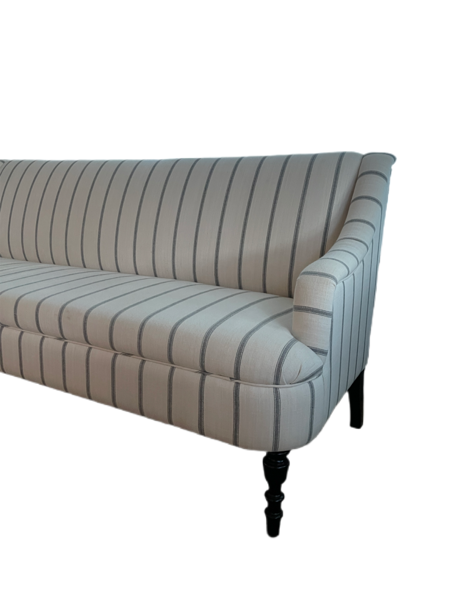 • Custom made dining room banquette bench. Tight seat and back for a tailored look with gentle sloping arms and turned solid wood legs.