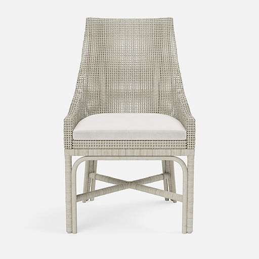 • The Isla dining chair's sleek wingback frame is casual yet refined in finely woven rattan. Rounded legs and a rounded X-stretcher are covered in peeled rattan Available in natural or grey. Cushion default is white fabric but customizable.