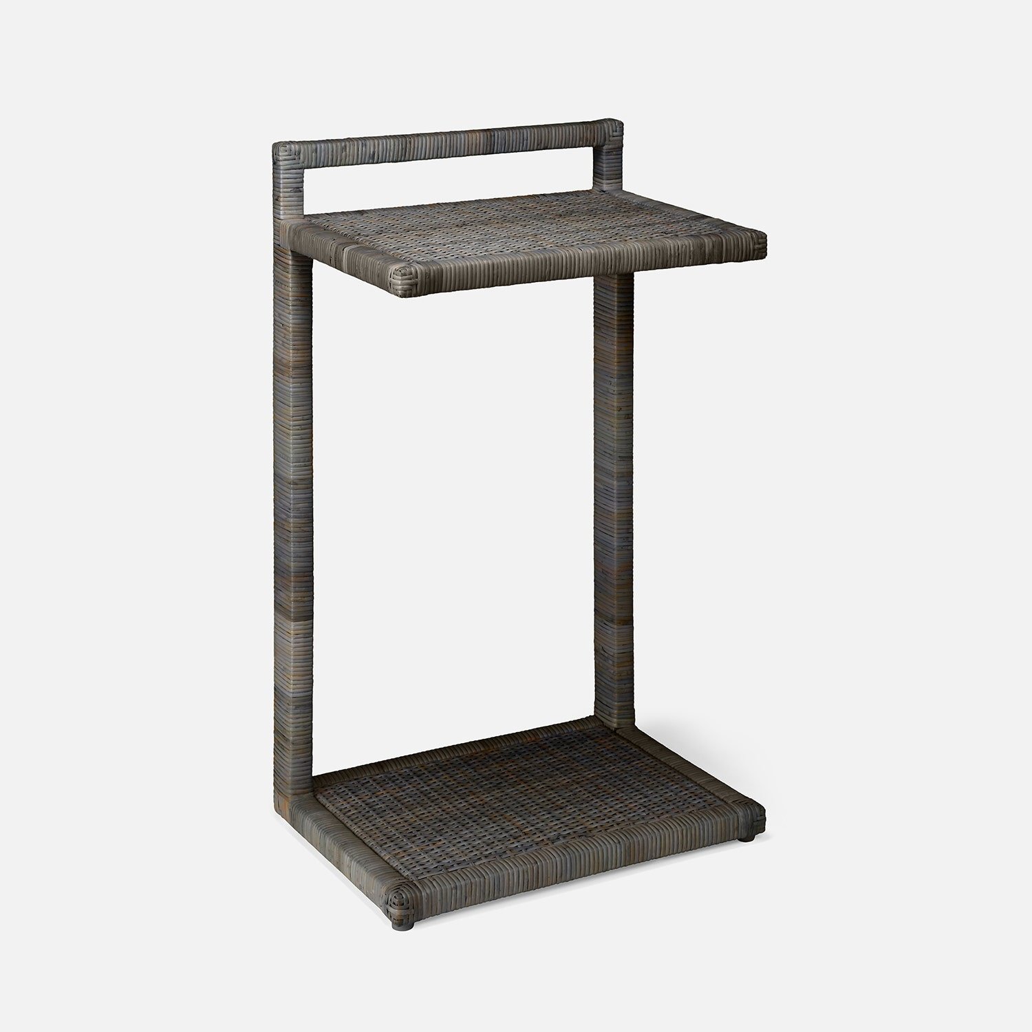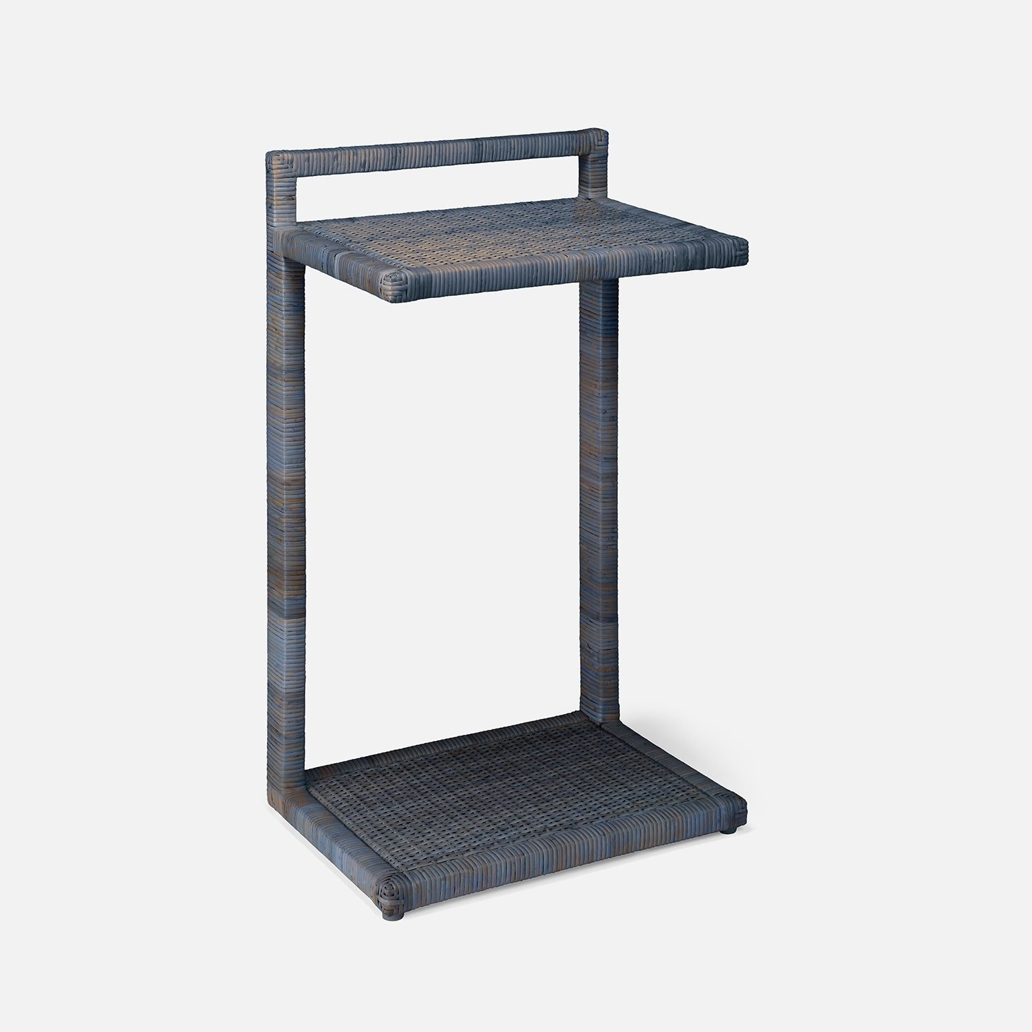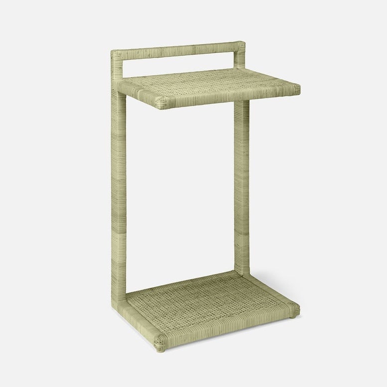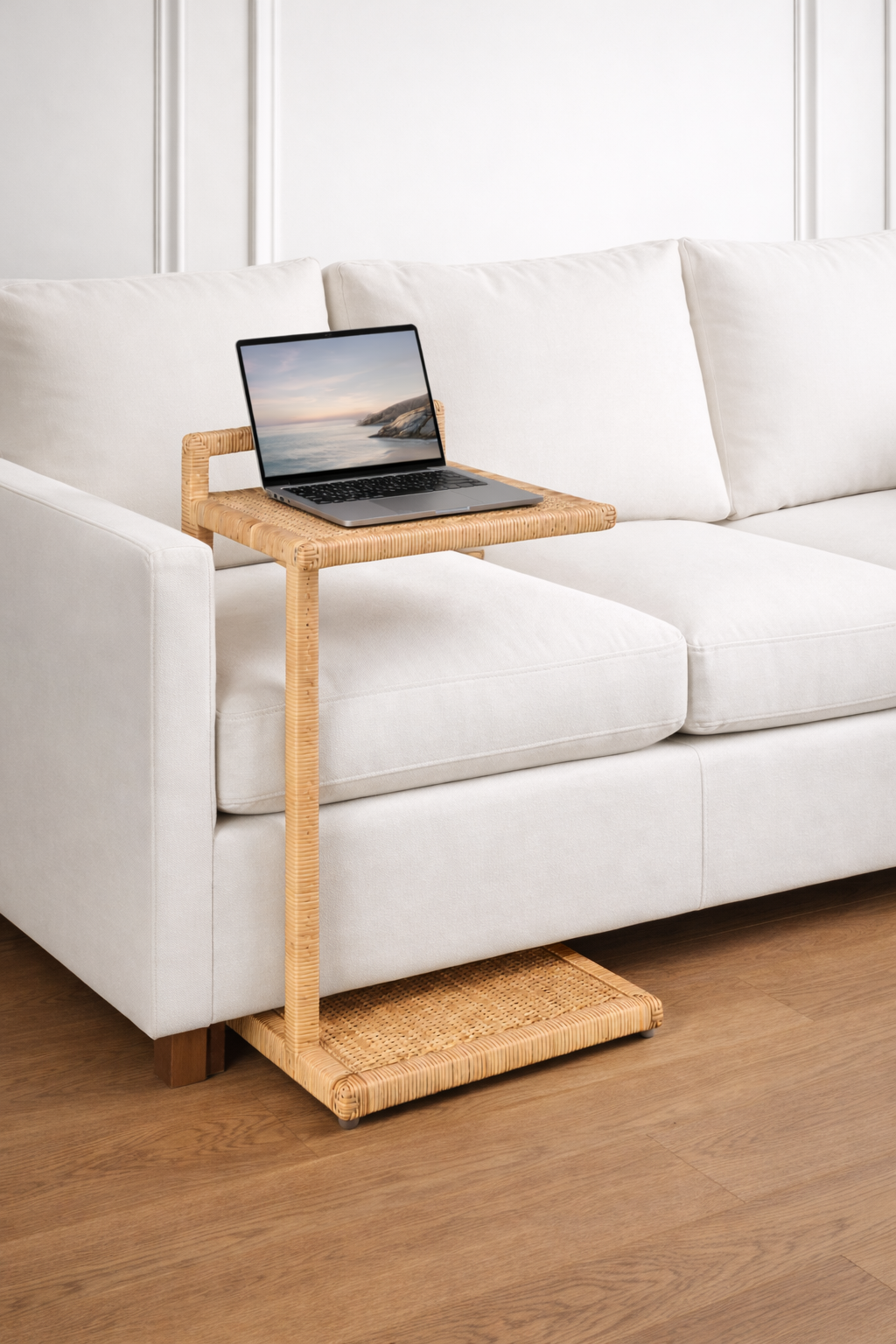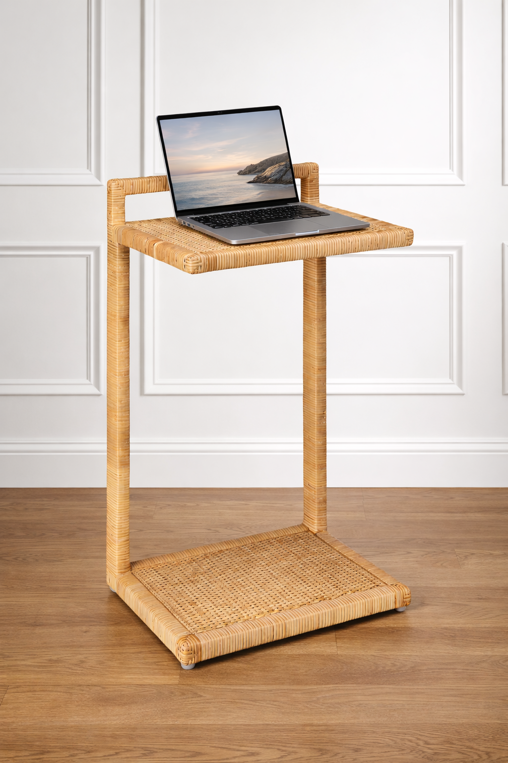 • A handcrafted Isla Laptop Table with a tightly wrapped natural peeled rattan frame and dense basket weave shelves — perfect for laptops, books & décor in chic interiors.