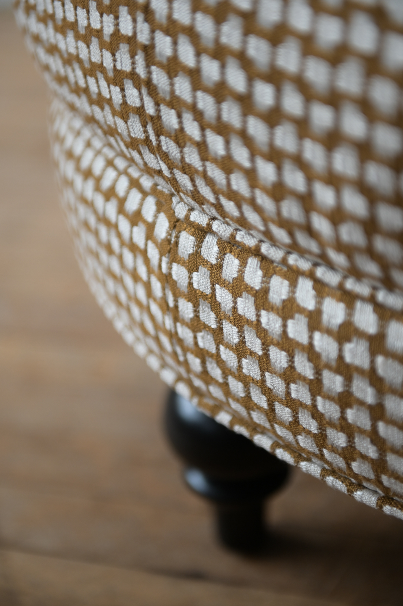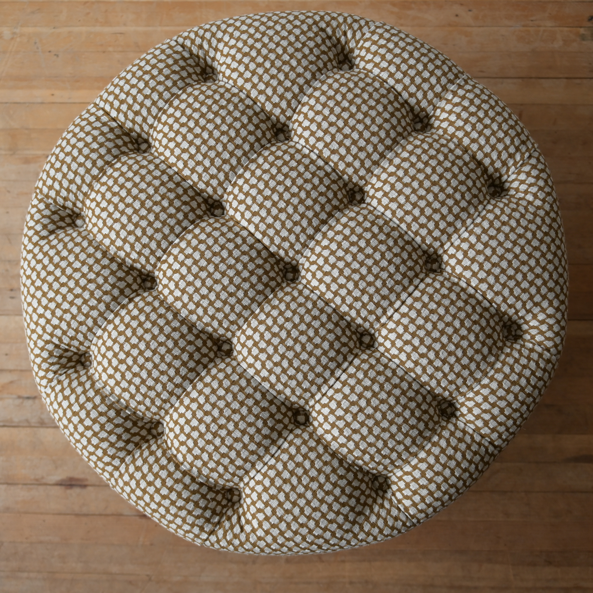 • Elevate your space with the Melanie round tufted ottoman by Gild & Co. Seen here in luxurious Sanderson woven small-scale pattern, it features solid wood construction. Designed and built locally, each ottoman is made to order in your choice of fabric.