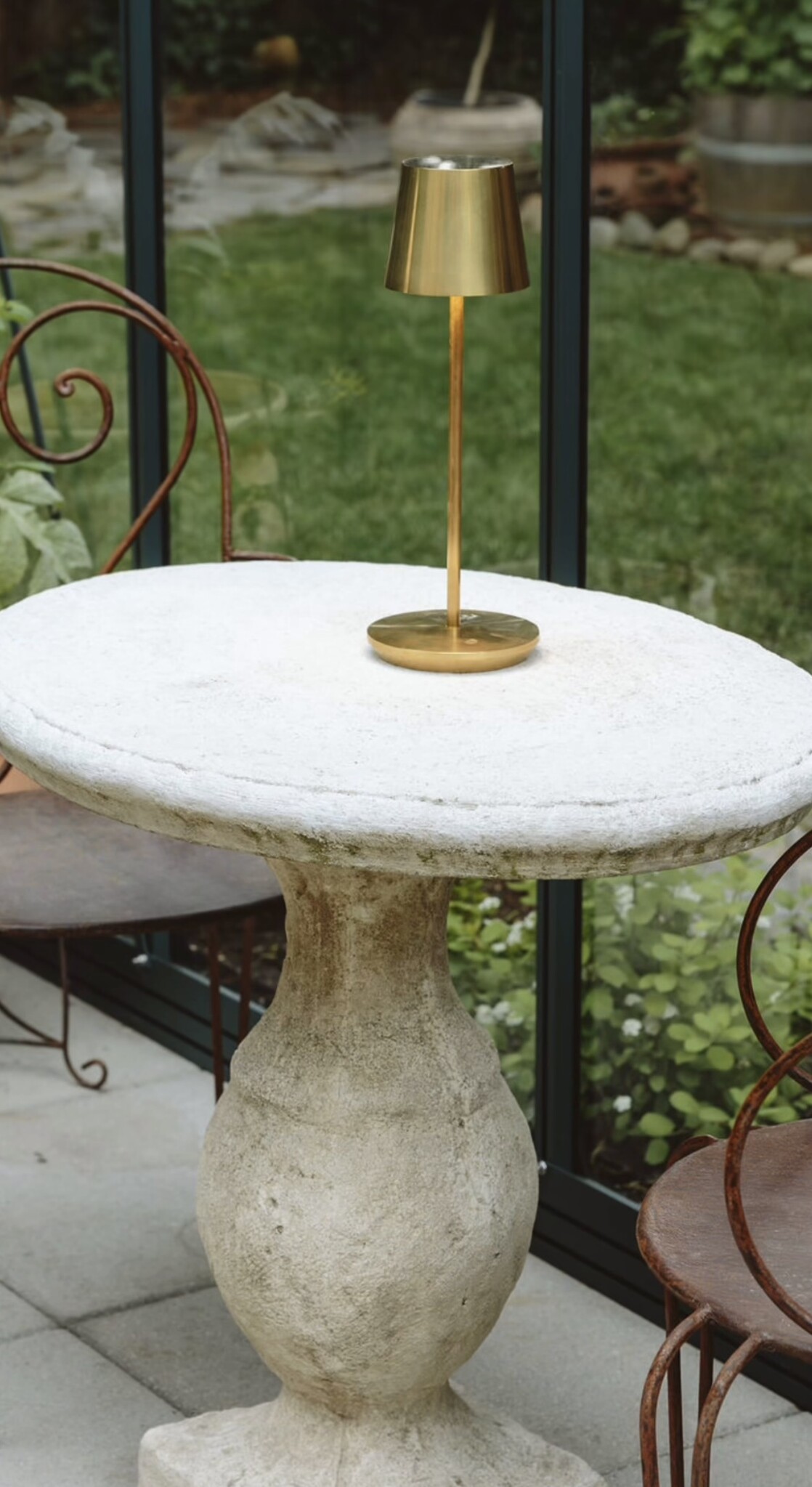 • A sturdy, petite bistro-style rechargeable table lamp—perfect for outdoor evenings. Features built-in three-level dimming and charges easily with the included USB cord. Stylish, functional, and effortlessly portable.