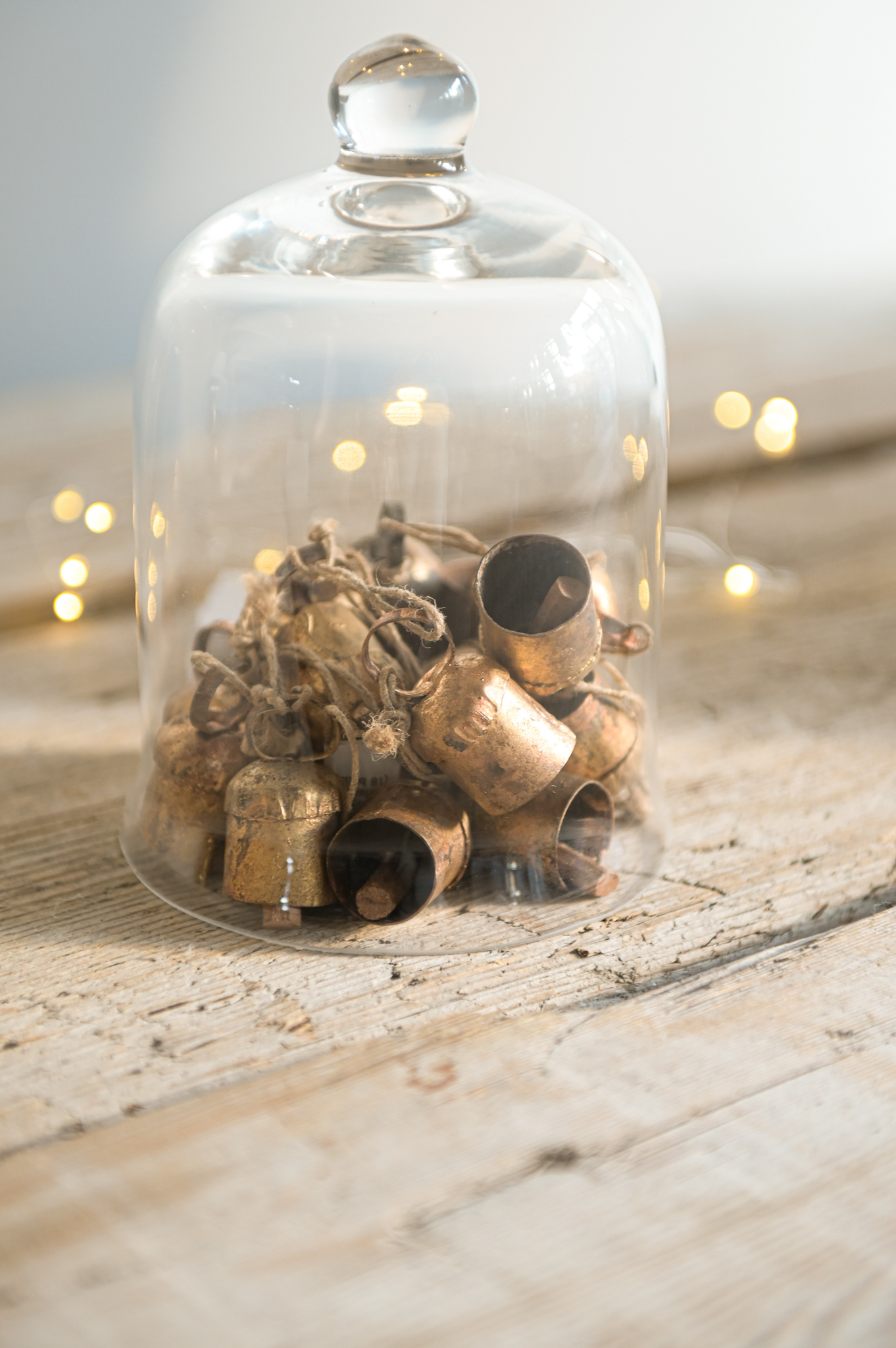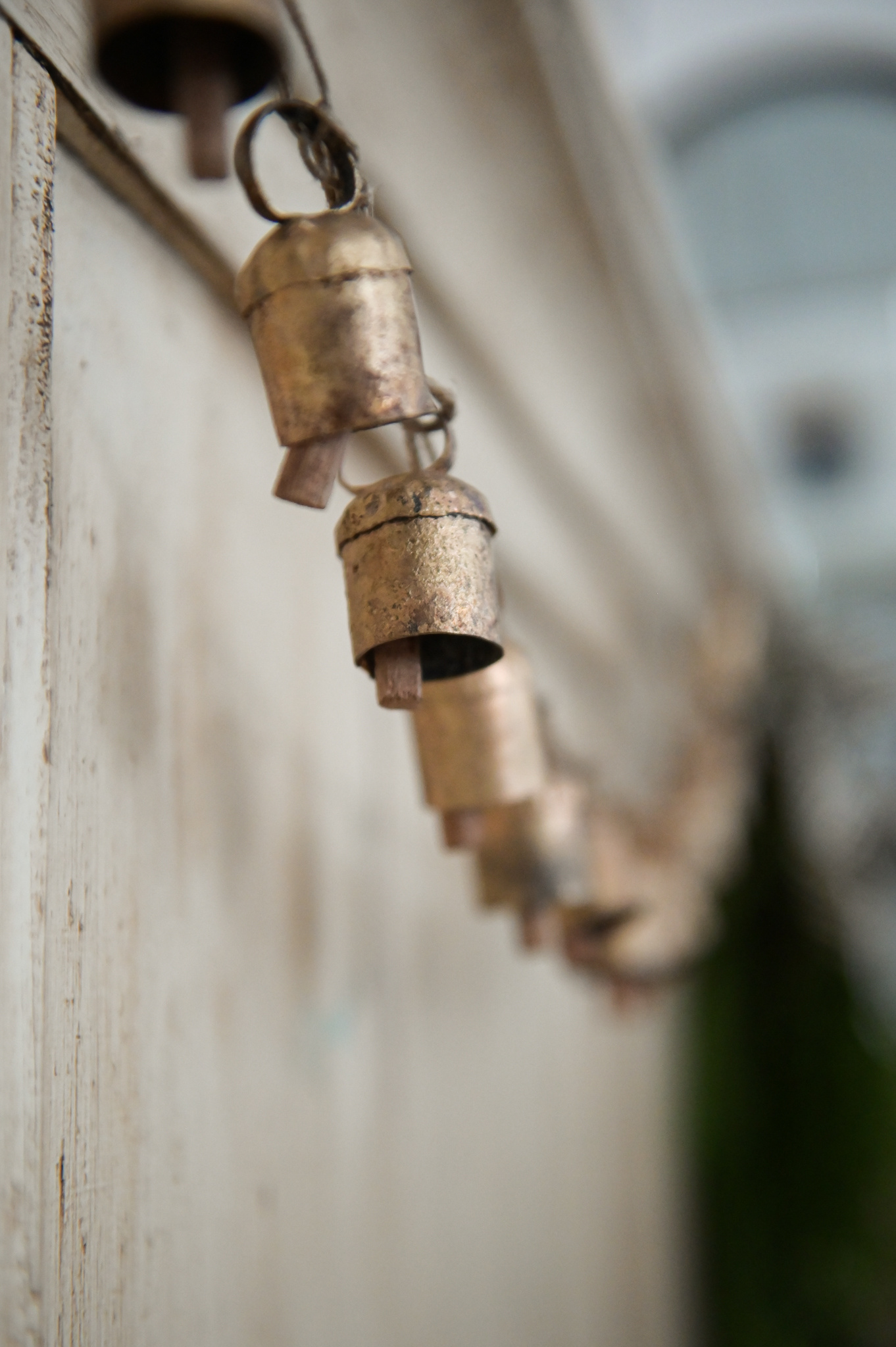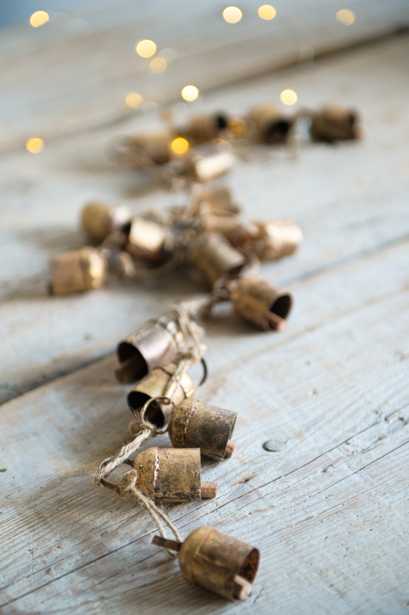 • A strand of eighteen small vintage style brass Noah bells. Put them on the door, wreath, mantle or let your festive creative juices flow.