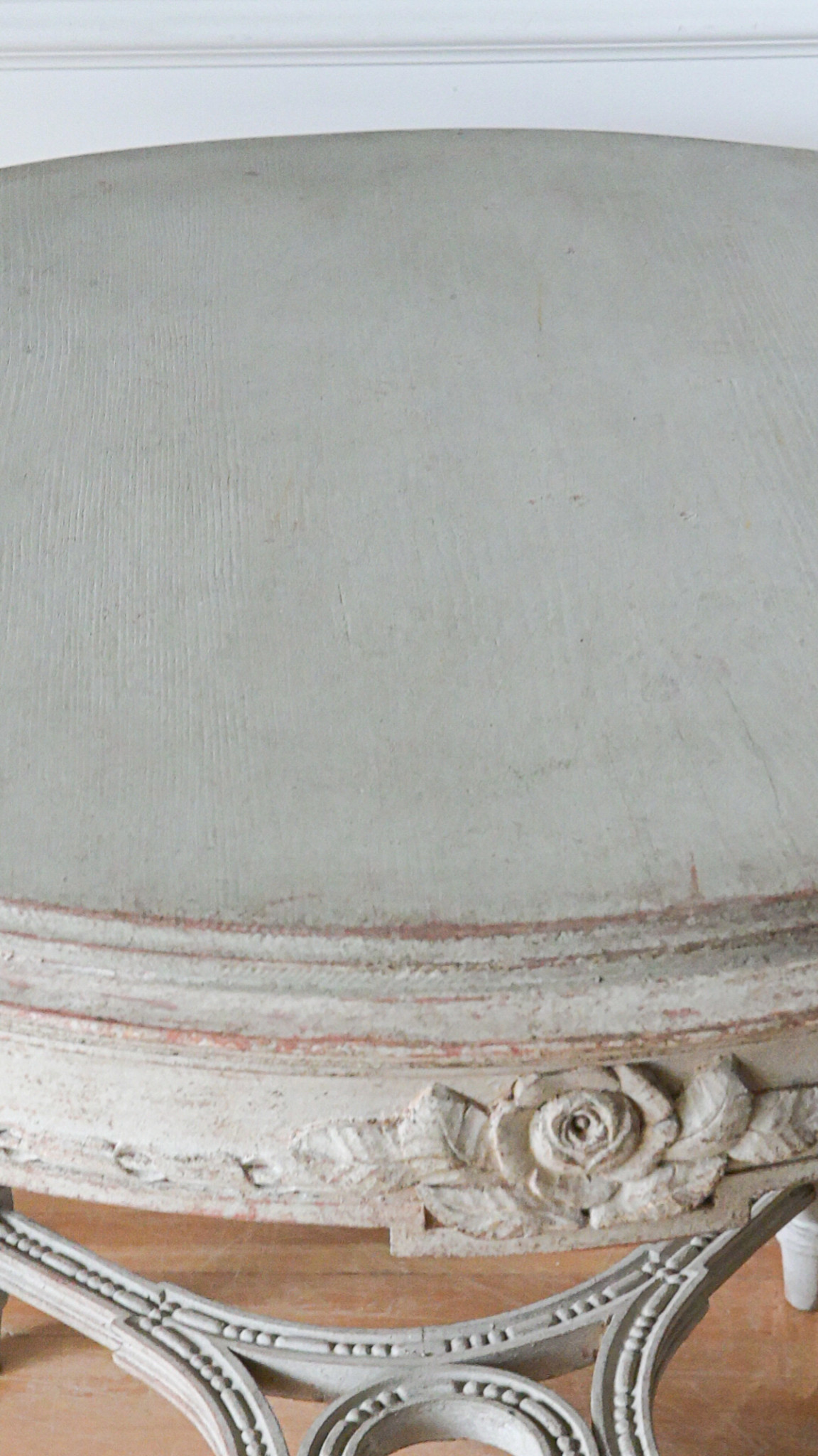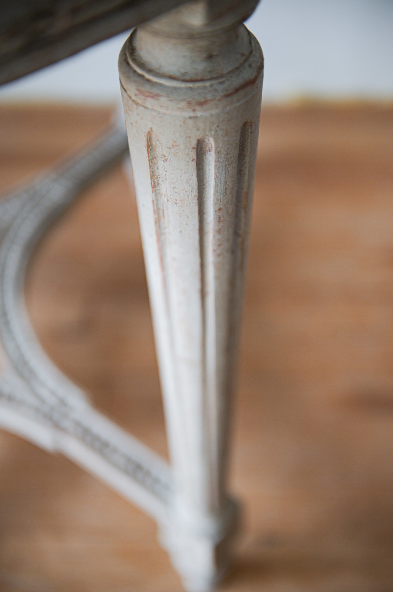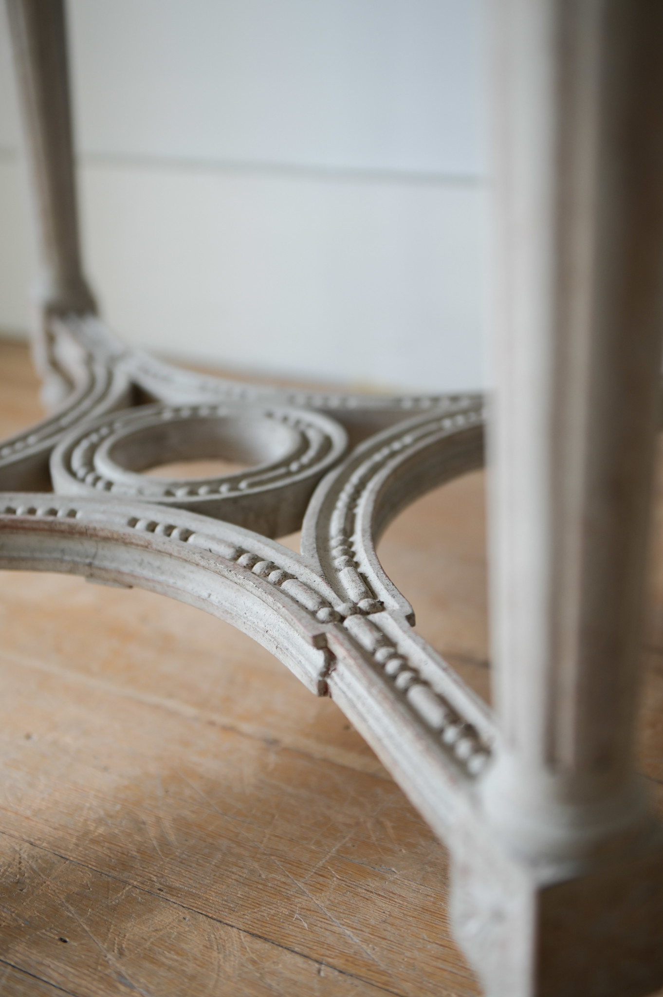 • Antique round Gustavian Swedish coffee table in layered grey tones. Swedish, circa 1900–1920. Featuring four carved legs with fluted detailing, a decorative apron, and a stabilizing stretcher base. Elegant and well balanced. Approx. 26.6” H x 32.3” Dia.