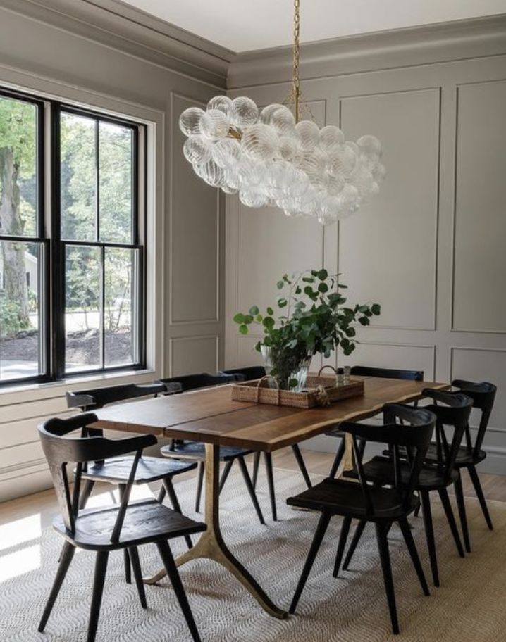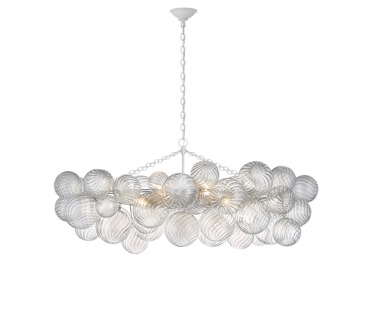 • Artisanal glass elevates the Talia series by Julie Neill for a new take on the simple glass globe light fixture. Light shimmers through multiple swirled glass orbs attached to metal baskets, creating a whimsical flourish.